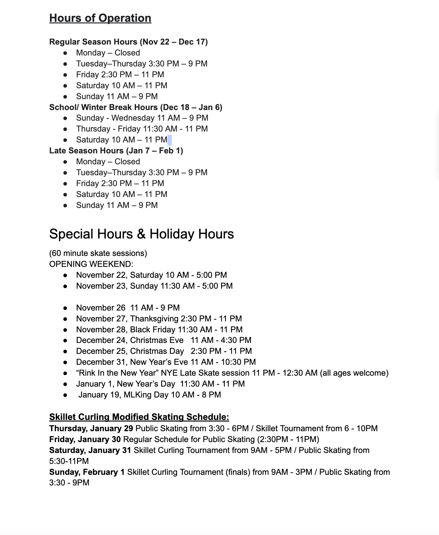 Season Passes are available NOW! We offer individual and family passes so you may skate unlimited days with some exceptions and times from November 22, 2025 - February 1, 2026. Great for skaters who come often. Passes are non-transferable and non-refundable. Individual Passes are $125 and a Family Pass is $300 and covers a family of four. $50 per additional family member.